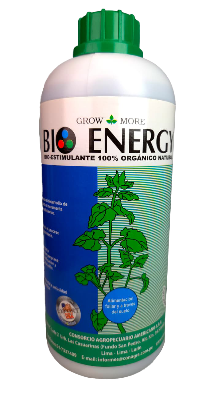 Bioestimulante orgánico que proporciona extractos de algas marinas, cebada y alfalfa, aminoácidos, complejo de azúcares, vitaminas, quelatos naturales y elementos menores.